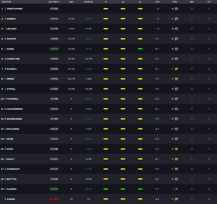 第23圈,迈凯伦率先反应,诺里斯进站换上了硬胎,出站后位列第7位。阿尔本因维修区事件被罚时10秒。