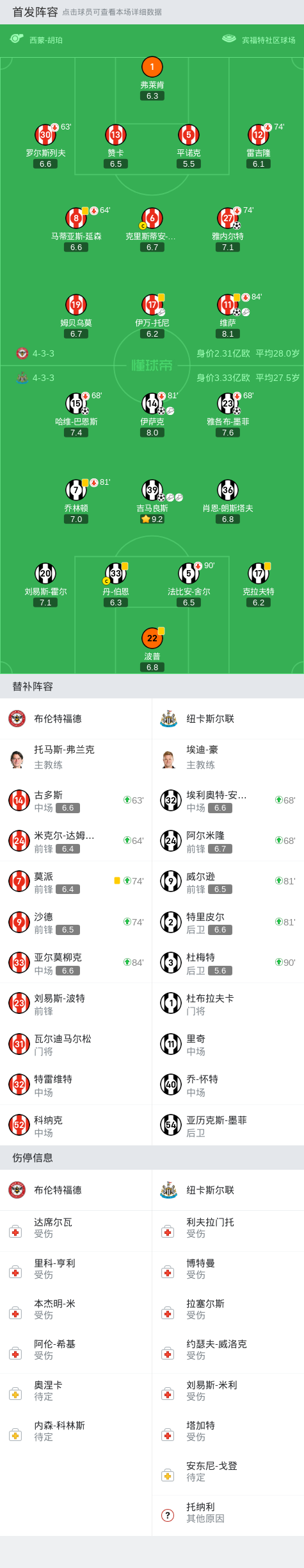 纽卡4-2布伦特福德赛季排名第七,伊萨克传射,吉马良斯造3球