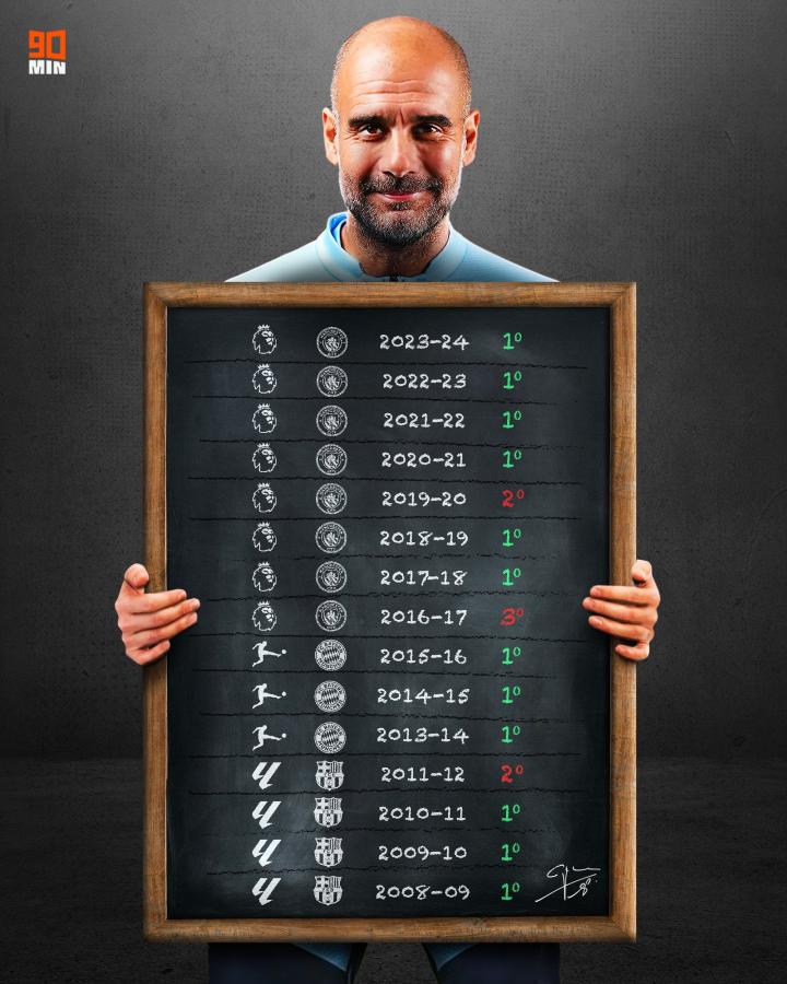 2023-24赛季英超落幕,瓜迪奥拉执教的曼城完成史无前例的四连冠,至此,瓜迪奥拉执教生涯15个顶级联赛赛季夺得了12座联赛冠军。