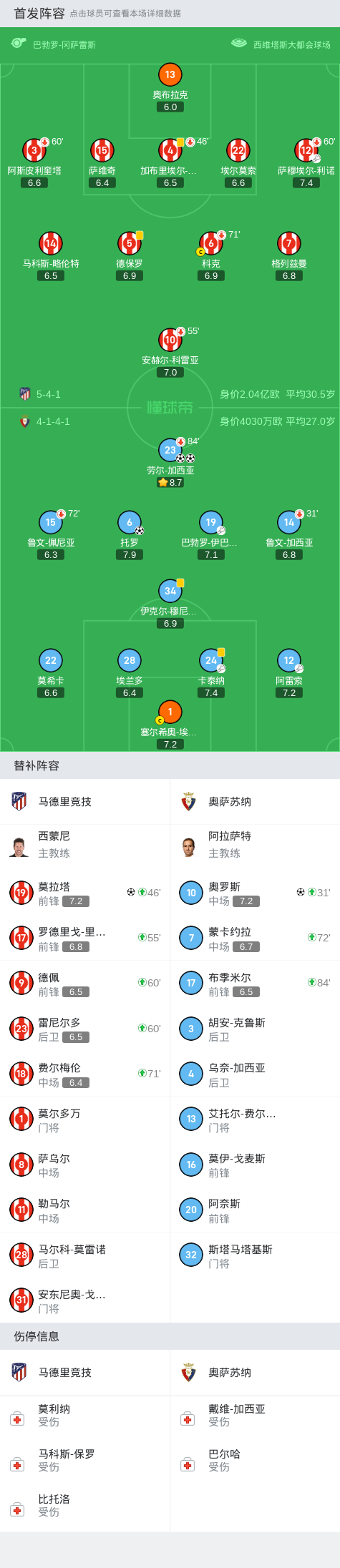 马竞1-4奥萨苏纳,莫拉塔建功,劳尔-加西亚双响,托罗建功