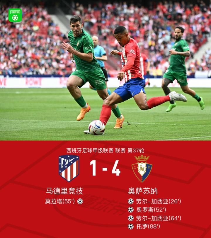 在西班牙足球甲级联赛第37轮的比赛中,马德里竞技队在主场迎战奥萨苏纳队。上半场,劳尔-加西亚推射破门,利诺兜射击中门框,格列兹曼推射打偏。下半场,奥罗斯补射破门,莫拉塔推射扳回一分,劳尔-加西亚再下一城梅开二度,托罗抽射建功,最终,马竞1-4奥萨苏纳联赛四连胜遭终结。