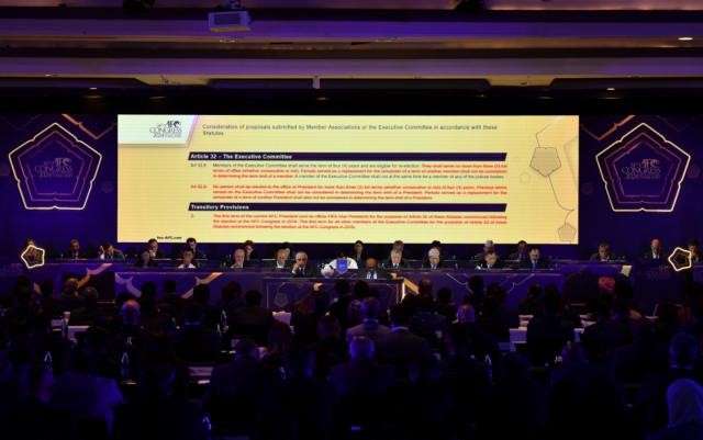 大会的第14项议题是对原来亚足联章程中的第32章第8条和第9条提出修改。按照原先的章程规定,一名当选执委在亚足联执委会中的任期为4年、最多只能是三届完整的任期,如果是一个周期中增补当选的,不包括在内。而且,当选亚足联主席,一个任期也是为4年、最多只能是三届完整的任期,如果是一个周期中增补当选的同样不包括在内。
