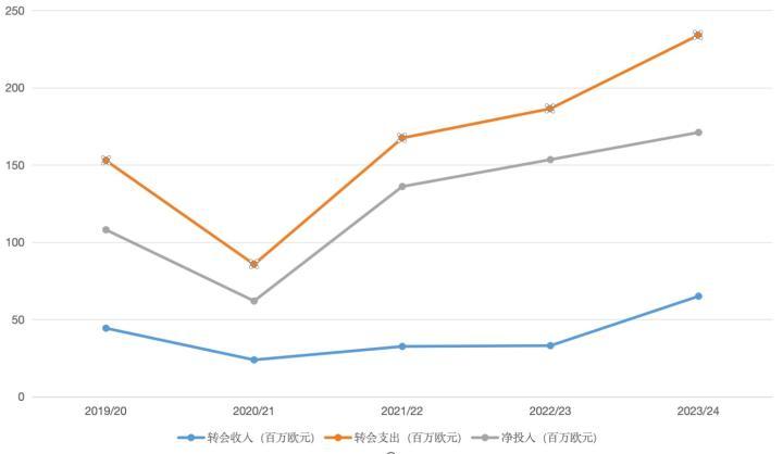 自19/20至23/24赛季阿森纳的转会收支折线图