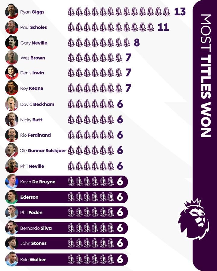 2023-24赛季英超落幕,曼城完成史无前例的英超四连冠,7年里6次夺冠,完整经历了这一历程的德布劳内、福登、埃德森、伯纳多-席尔瓦、斯通斯、凯尔-沃克等6名曼城球员收获第6座英超冠军,并列英超历史球员夺冠榜第七。