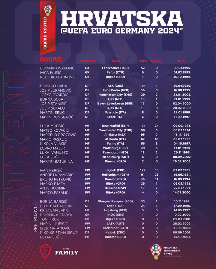 克罗地亚国家队将在下个月前往德国参加欧洲杯,同组对手包括西班牙、意大利、阿尔巴尼亚。主帅达利奇现已公布大名单,莫德里奇、格瓦迪奥尔、布罗佐维奇、科瓦契奇、佩里西奇等名将悉数在列。