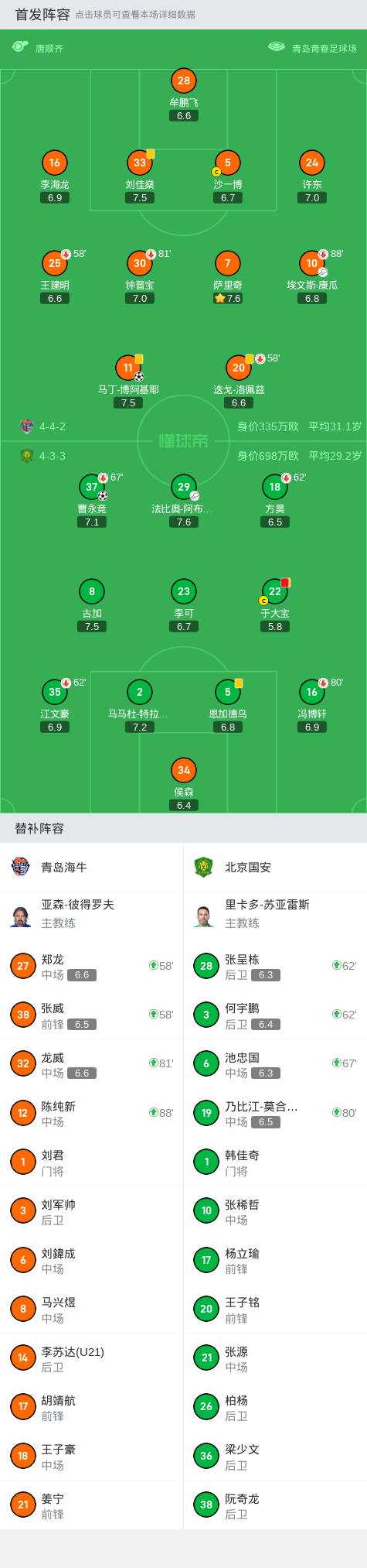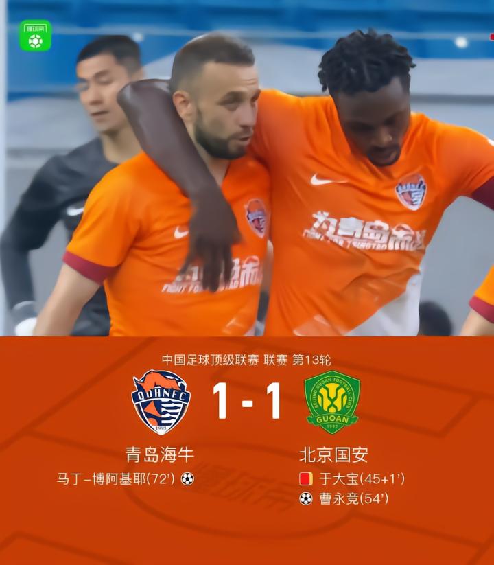 海牛1-1十人国安,曹永竞破门,博阿基耶浪费机会后救主
