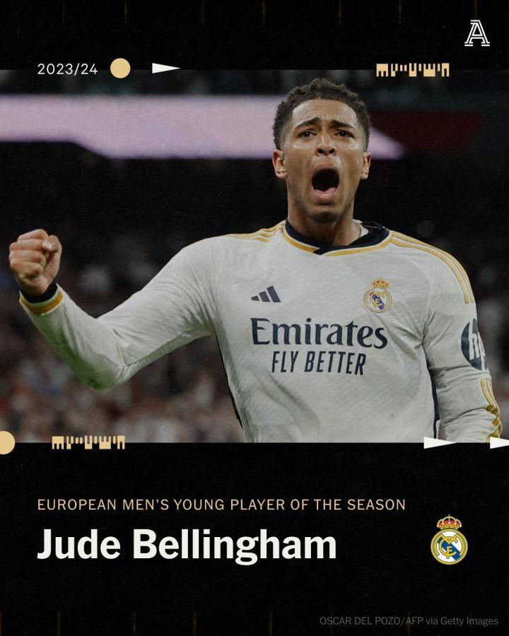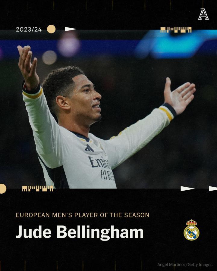 皇家马德里中场贝林厄姆被知名媒体The Athletic评为2023-24赛季欧洲最佳男足球员和最佳年轻男足球员。