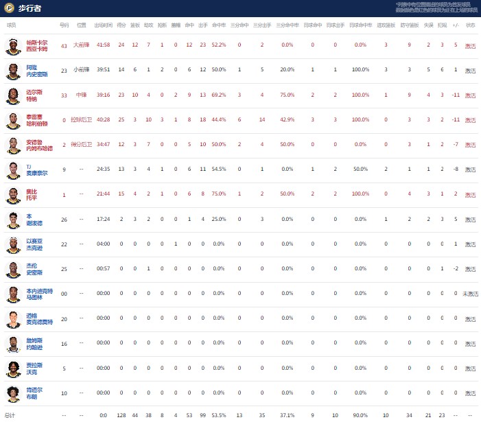 印第安纳步行者哈利伯顿25分3板10助3断1帽,西亚卡姆24分12板7助1断,迈尔斯-特纳23分10板4助2帽。
