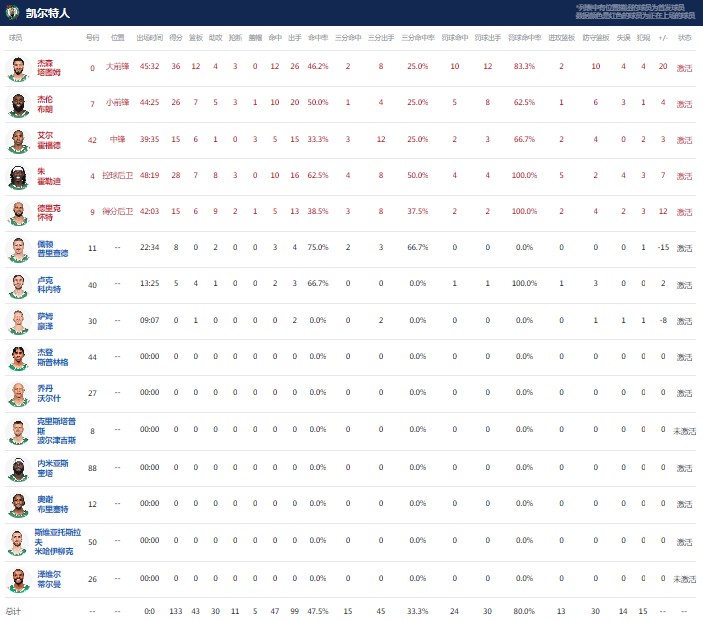 波士顿凯尔特人塔图姆36分12板4助3断,霍乐迪28分7板8助3断,杰伦-布朗26分7板5助3断1帽;