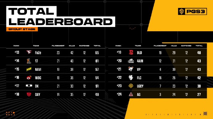 第三个比赛日,PCL战队PERO、17、WBG出战,三支队伍表现平平,以拿分为首要目的,杀入决赛圈的次数都寥寥无几。好在三支队伍稳扎稳打,都有稳定的排名分和淘汰分入账,最终六张地图战罢,PERO收获23分,17收获27分,WBG收获29分。