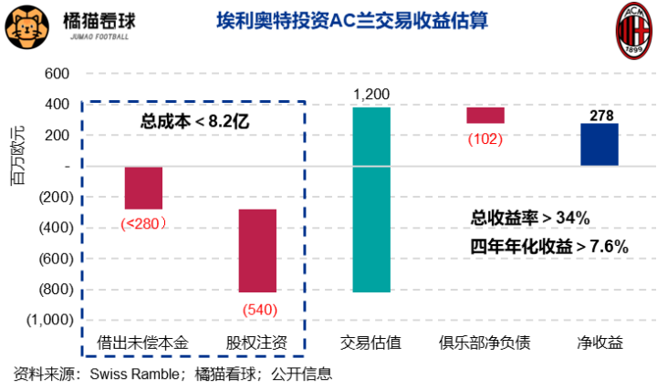 国米目前已贵为意甲冠军,很难指望新老板会再向俱乐部注入资金支持进一步发展。作为参照,埃利奥特当初虽成功将米兰成功脱手,由于为整顿俱乐部经营又投入了5.4亿巨资,最终整个交易的年化收益率不到10%。