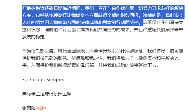 张康阳通过国米官方社媒控诉橡树资本