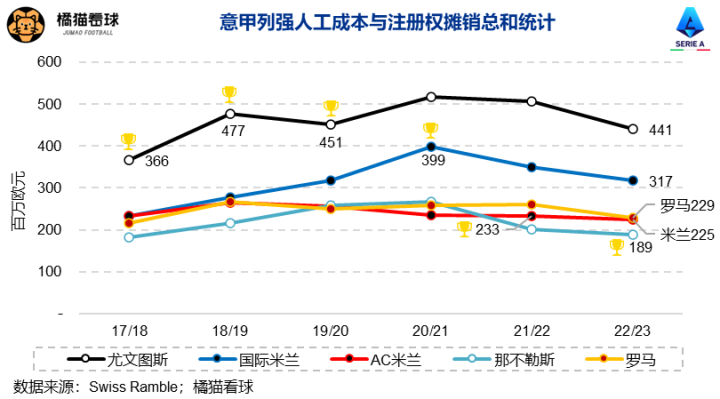 为扳倒意甲霸主尤文图斯,国米相继高薪聘请了王牌经理人马罗塔和冠军主帅安东尼奥-孔蒂。首夺意甲的20/21赛季,国米工资额和注册权摊销两项成本合计占俱乐部营业收入的113%,疫情三年狂亏4.88亿,怎能不出问题?