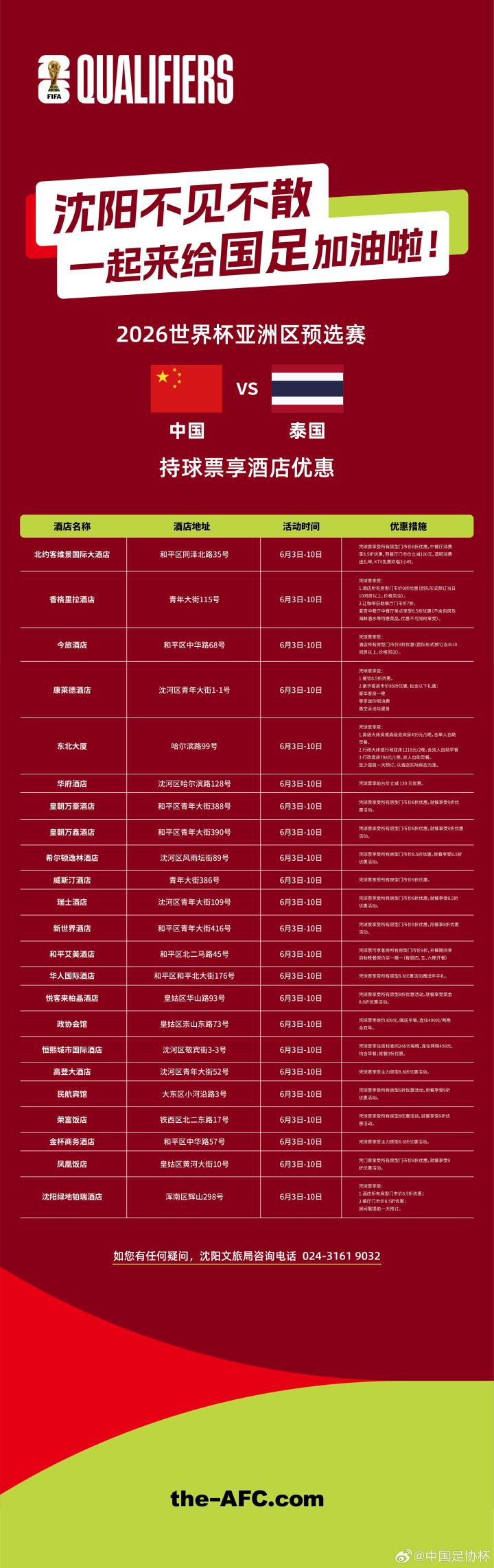 同时,为了欢迎全国球迷前来沈阳为国足加油,我们还准备了“凭门票订单享酒店优惠”活动,您可在以下23家酒店享订房优惠。