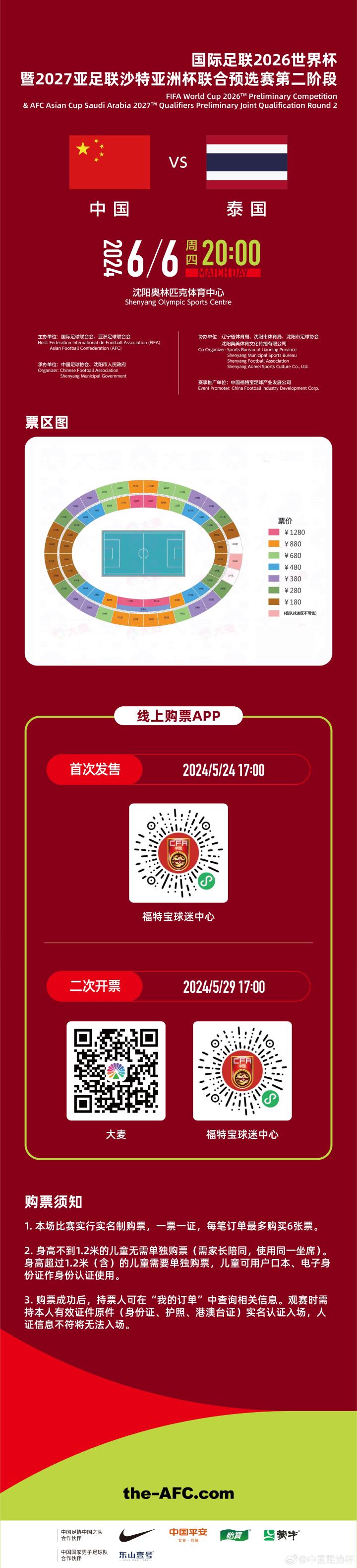 2024年6月6日20点,中国国家男子足球队将在沈阳奥体中心迎战泰国队。为了最大化满足球迷朋友们的购票需求,本场比赛的售票将分两个阶段,