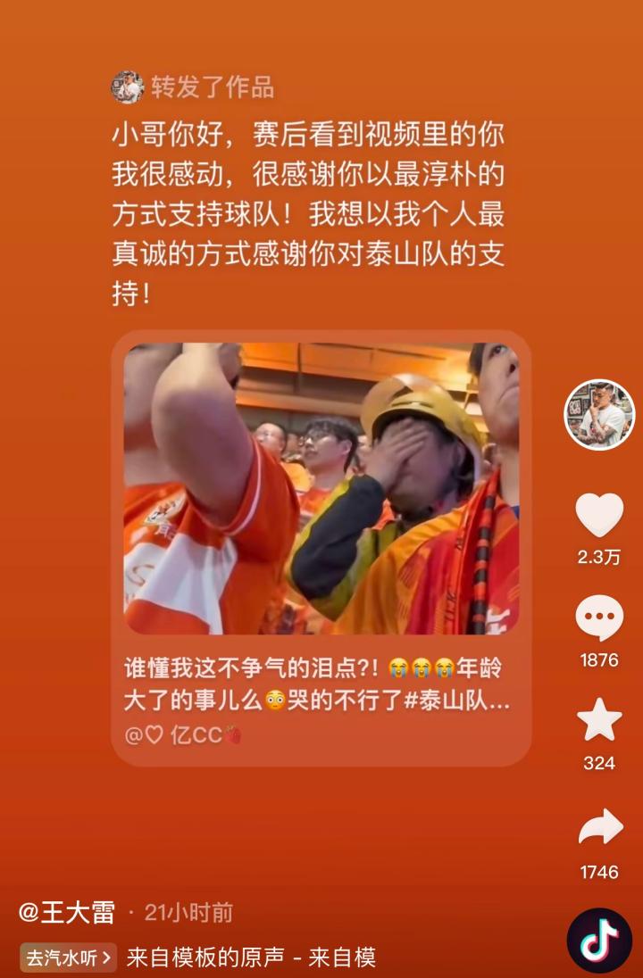 在天津为泰山队助威的外卖小哥走红,王大雷发寻人启事寻找他
