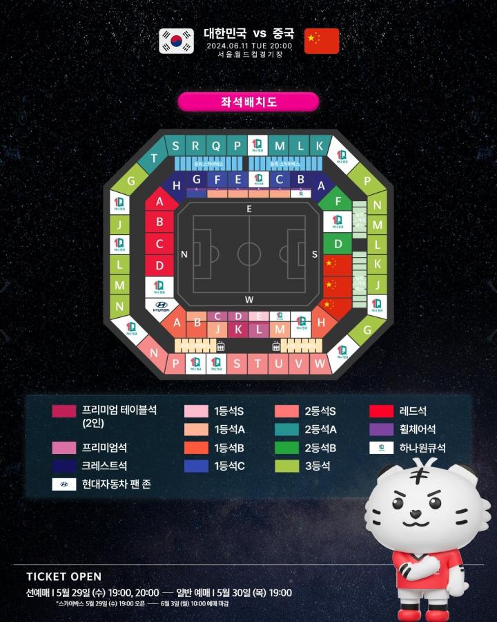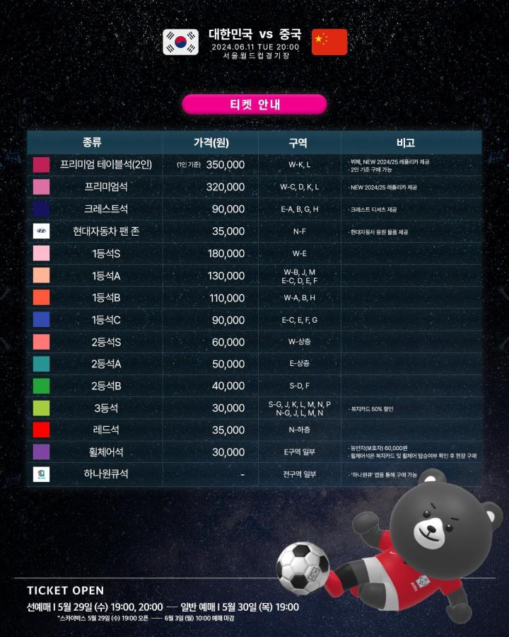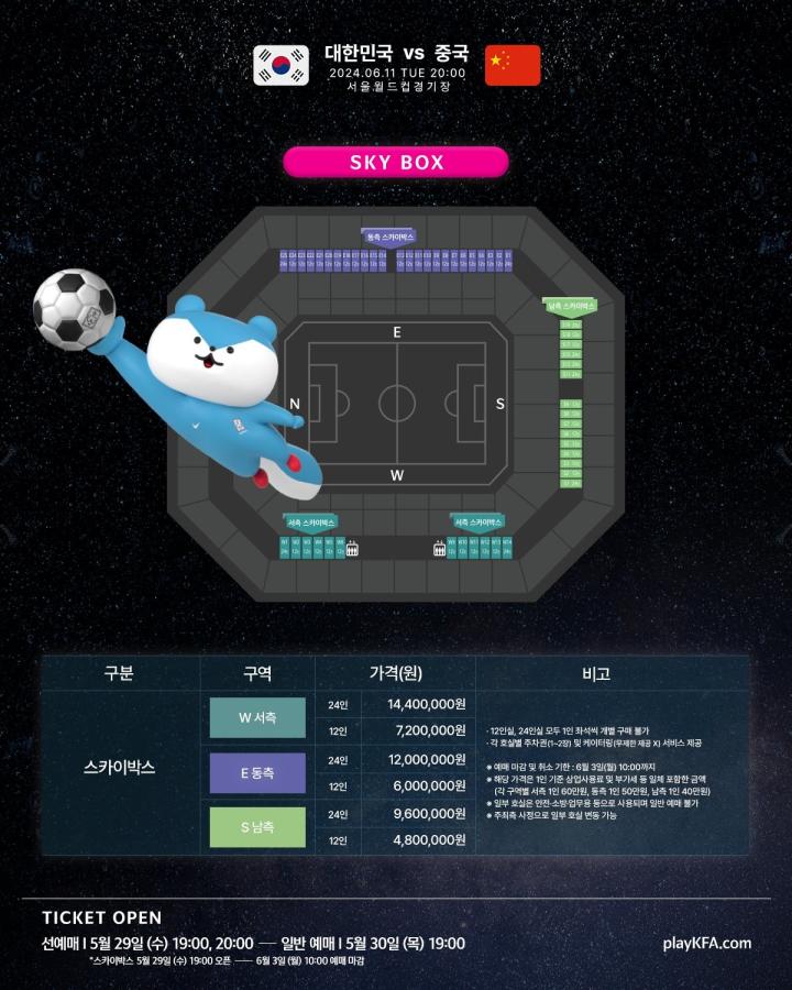 球票将于北京时间29日晚6点开始销售(韩国足协PlayKFA VIP会员),普通用户将于30日晚6点开始销售。