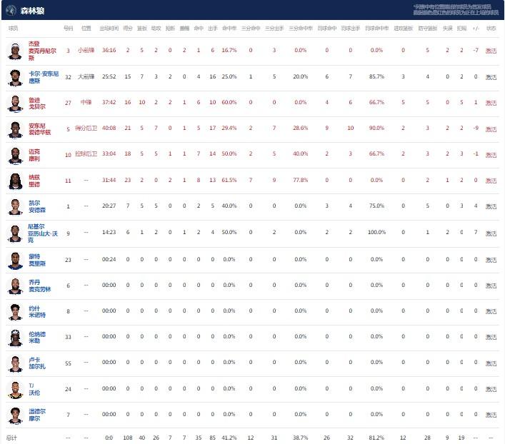 明尼苏达森林狼纳兹-里德23分2板2断1帽,安东尼-爱德华兹21分5板7助1帽,康利18分5板5助1断1帽;