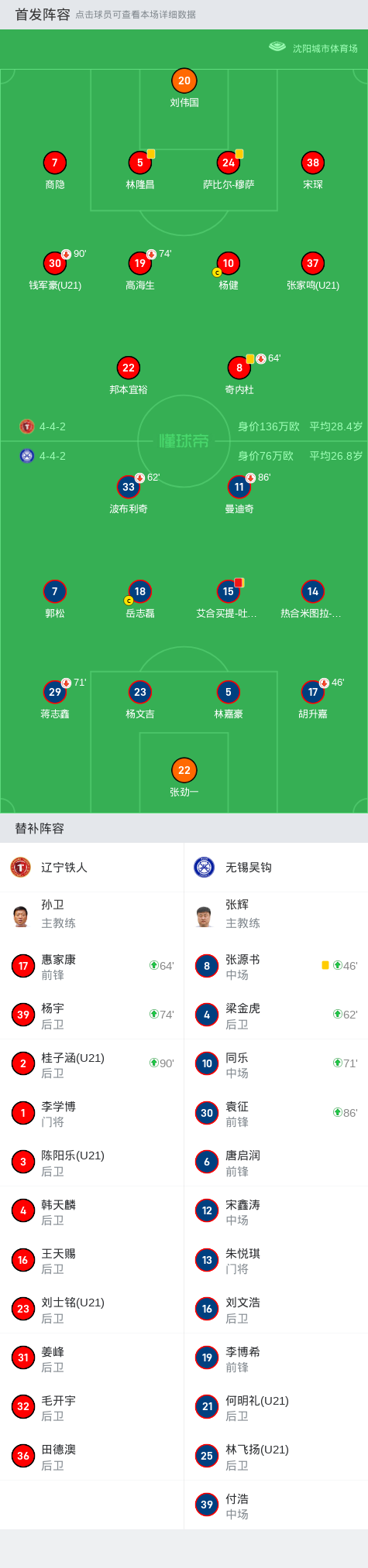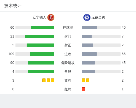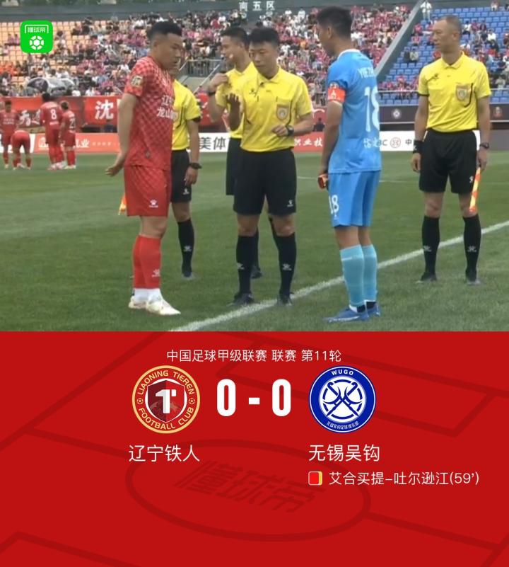 北京时间5月25日中国足球甲级联赛 联赛 第11轮,辽宁铁人主场对阵无锡吴钩。上半场双方互交白卷,主队占据上风。补时阶段波布利奇射门击中横梁,错失绝佳进球机会。下半场,艾合买提故意撞人犯规,吃到第二张黄牌被罚下。最终辽宁铁人主场0-0战平十人无锡吴钩。