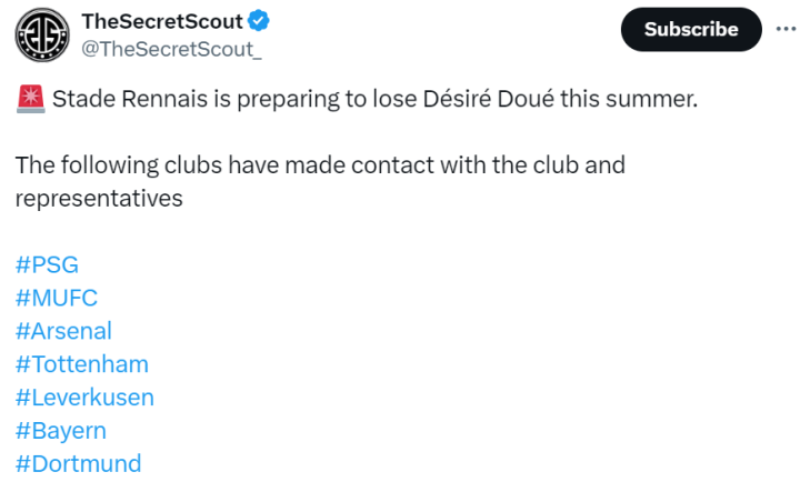 据TheSecretScout的报道,阿森纳,巴黎,曼联,热刺,勒沃库森,拜仁和多特蒙德都接触了杜埃的代表和雷恩俱乐部。
