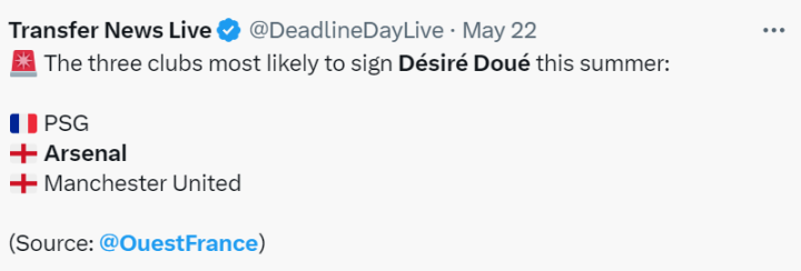 报道称,巴黎,曼联和阿森纳具有支付杜埃转会费的能力,且对杜埃表达了浓厚的兴趣。