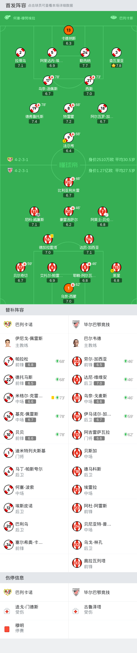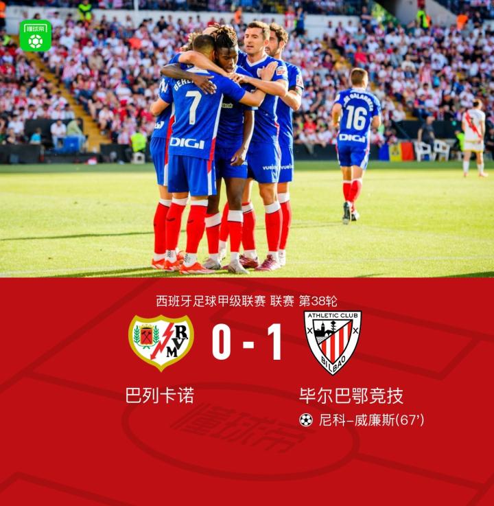 在西班牙足球甲级联赛第38轮比赛中,毕尔巴鄂竞技队客场对阵巴列卡诺队。上半场,两队均无建树。下半场,贝伦格尔助攻,尼科-威廉斯推射破门。全场比赛结束,毕尔巴鄂客场1-0战胜巴列卡诺。