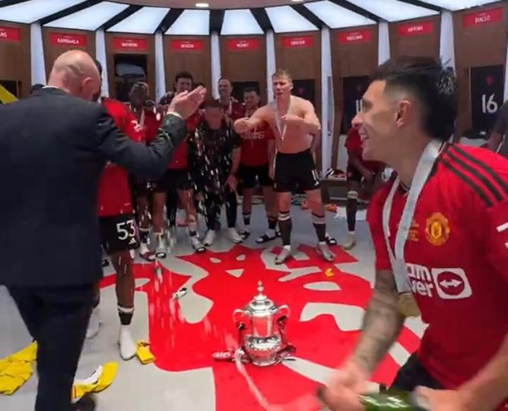 足总杯决赛,凭借加纳乔和梅努的进球,曼联在温布利球场2-1击败曼城夺冠,赛后曼联众将帅进行了一系列庆祝。