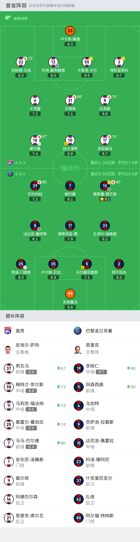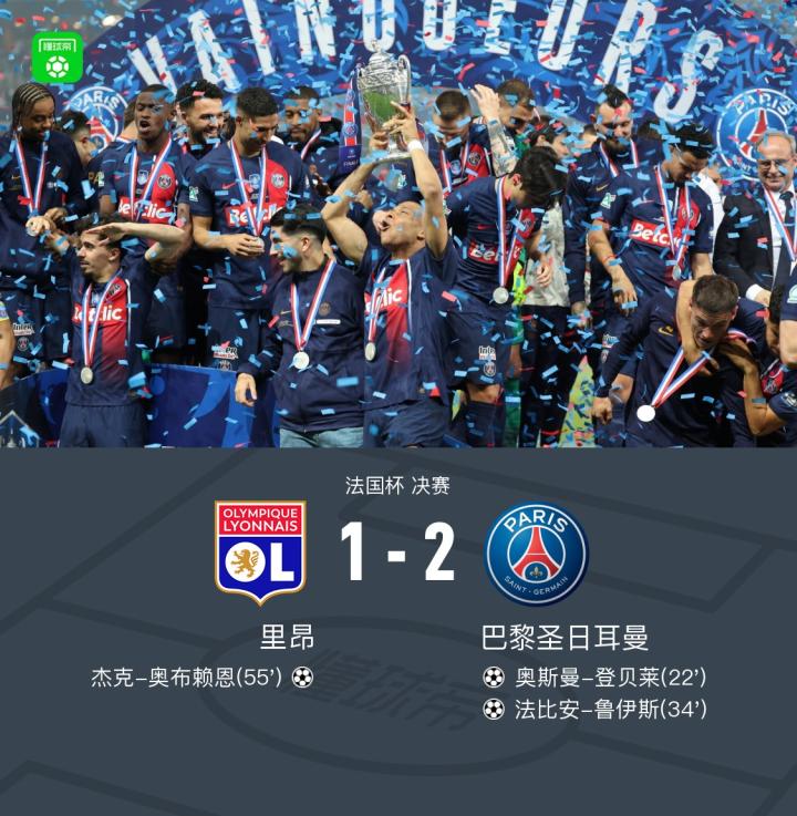 北京时间5月26日法国杯决赛,里昂对阵巴黎圣日耳曼。本场比赛是姆巴佩代表巴黎的告别战,法国巨星首发并打满全场。上半场,门德斯助攻,登贝莱破门。随后,登贝莱传球,鲁伊斯打门被挡随后补射建功。下半场,奥布赖恩头槌为里昂扳回一城。全场比赛结束,巴黎2-1战胜里昂,拿下本赛季法国杯冠军。