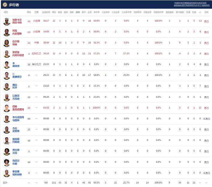 印第安纳步行者内姆布哈德32分4板9助,麦康奈尔23分9板6助1断,西亚卡姆22分3板6助1断;