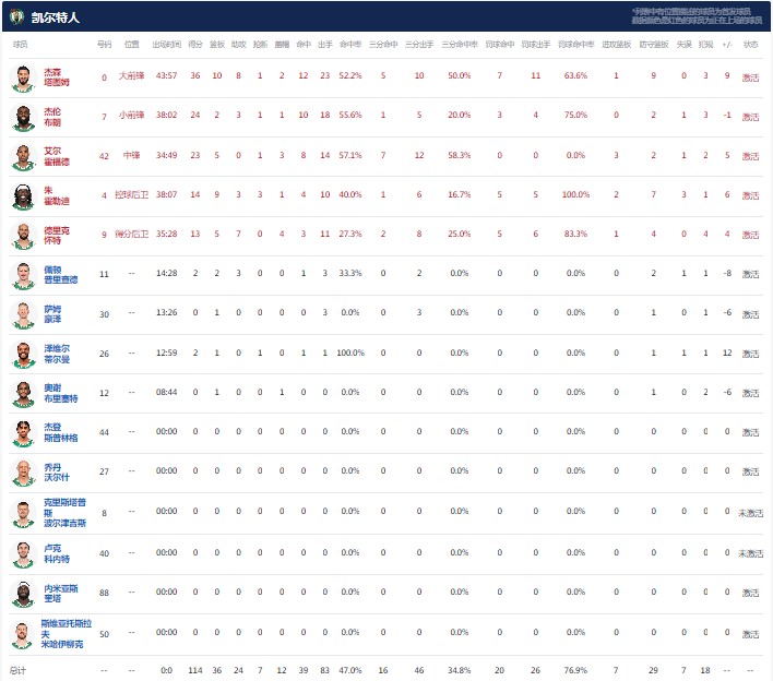 波士顿凯尔特人塔图姆36分10板8助1断2帽,杰伦-布朗24分2板3助1断1帽,霍福德23分5板1断3帽。