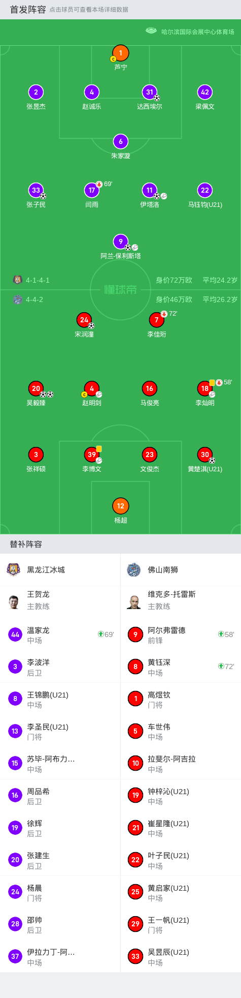 黑龙江冰城4-4佛山南狮伊塔洛传射,吴毅臻双响,黄楚淇绝平