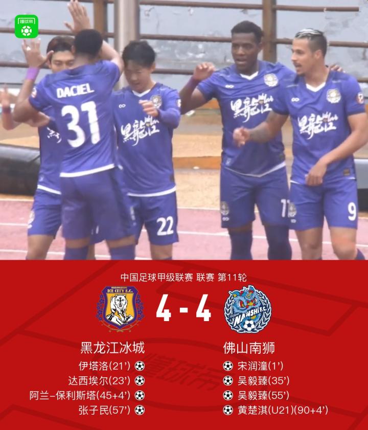 北京时间5月26日中国足球甲级联赛 联赛 第11轮,黑龙江冰城主场对阵佛山南狮。上半场开场第18秒,李灿明助攻宋润潼破门率先改写比分。阿兰-保利斯塔助攻,伊塔洛破门将比分扳平,达西埃尔门前乱战中破门将比分反超。李博文传中,吴毅臻捅射破门将比分扳平。阿兰-保利斯塔门前补射破门又将比分超出。下半场,赵明剑助攻吴毅臻破门再次扳平比分,张子民一脚世界波破门再将比分超出,补时最后阶段黄楚淇破门绝平比分。最终黑龙江冰城主场4-4战平佛山南狮。