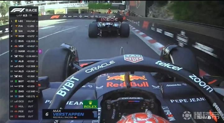 第63圈,维斯塔潘追击至拉塞尔车后,但在摩纳哥的赛道难以完成超车!后面的汉密尔顿还在不断缩小与维斯塔潘的差距!