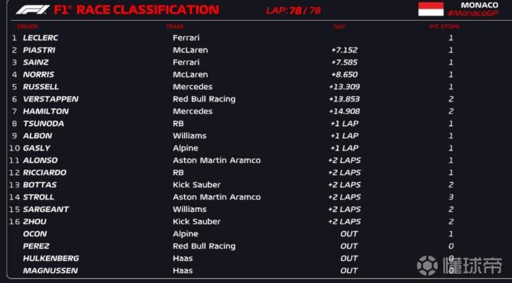 北京时间5月26日,F1摩纳哥站正赛结束。勒克莱尔全场领跑,以pole to win的方式夺得分站冠军,皮亚斯特里、赛恩斯位居二三,维斯塔潘仅排在第六。