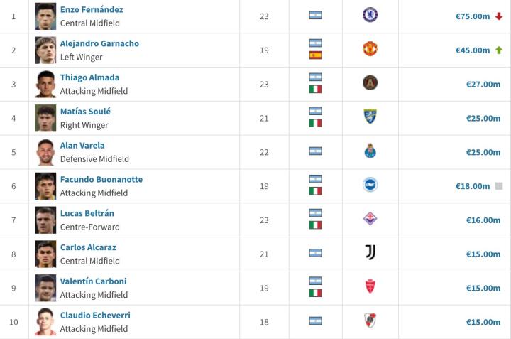 阿根廷U23球员身价前10位如下: