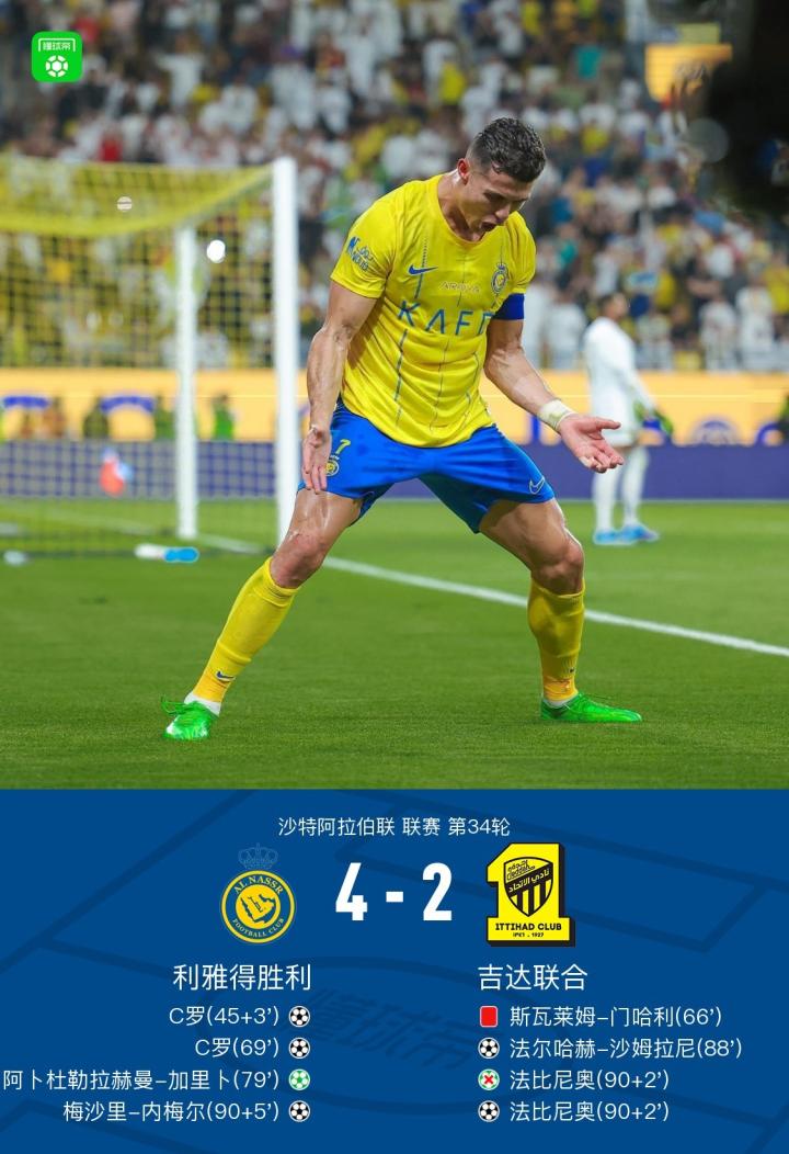 利雅得胜利4-2吉达联合,C罗梅开二度打破沙特联赛季进球纪录