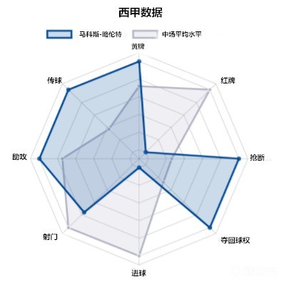 (图)略伦特上赛季的数据与西甲中场平均数据的对比