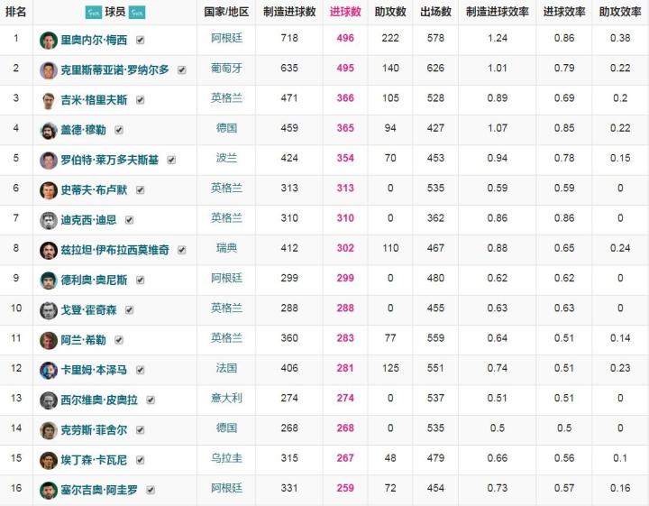第12是本泽马,他打进了281球,要是他这赛季留在皇马,他是有机会更接近300球的。第13是意甲历史射手王皮奥利,总共打进274球,第14是德甲历史第二射手费舍尔,总共打进了268球,第15是卡瓦尼,他打进了267球,第16是阿圭罗,他打进了259球。值得一提的是,榜单上这15名球员,只有3名球员的进球效率超过了0.8,分别是梅西、盖德-穆勒和迪克西-迪恩。