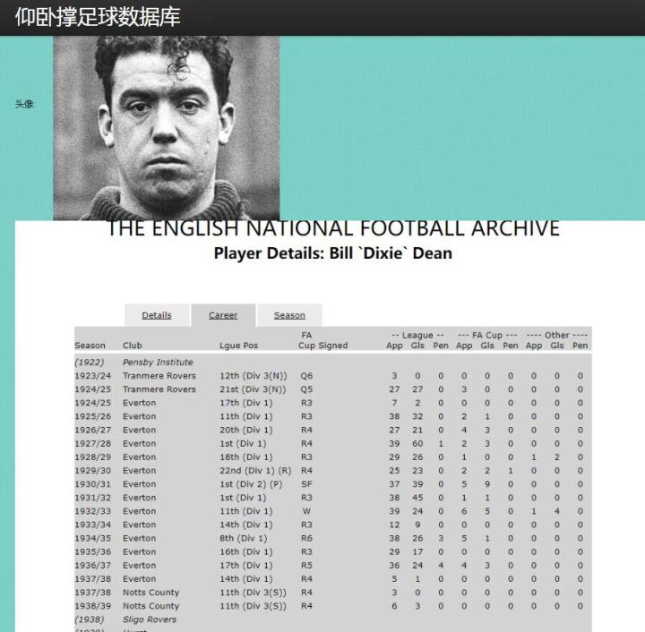 第7名是埃弗顿名宿迪克西-迪恩,他总共打进了310球,凭借强大的爆发力、射术和头球能力,他在上世纪20年代越位规则修改后大发神威,即便没有越位规则的变革他同样是当时最顶级的前锋,但越位规则的修改使得进攻方获利,这也让迪恩创造了一项至今无人能打破的进球纪录,那就是1927-28赛季他在英格兰顶级联赛39场打进60球,这至今仍然是五大联赛历史单赛季进球纪录。
