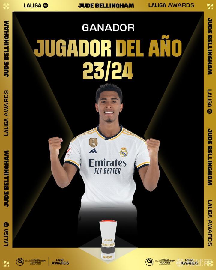 官方消息,皇家马德里中场贝林厄姆当选2023/24赛季西甲联赛最佳球员。