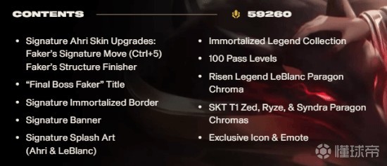 据官方文章显示,本次皮肤售卖共有三个档次,分别为5430 RP(约40美元 300元人民币)、32430 RP(约250美元 1800元人民币),最高档更是贵达59260 RP(约450美元 3200元人民币),其中包含通行证、多款限定纪念道具,例如英雄击杀特效、防御塔击杀特效、定制播报、皮肤形态切换、游戏内Ctrl+5的Faker招牌动作、“Final Boss Faker”头衔等等。