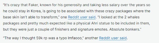 价格在公布后引起了无数外网玩家的不满,也是引起了许多玩家热议:“Faker以慷慨著称,为了留在韩国,他多年来一直拿着更少的薪水,现在却要和这些疯狂的包装捆绑在一起,这太疯狂了。”“我看了看,还期望它们包含一个实体版的阿狸雕像,但它们只是几个签名和表情。绝对疯狂。”“我还以为这价格是拳头打错字了。”