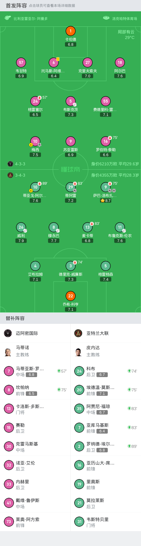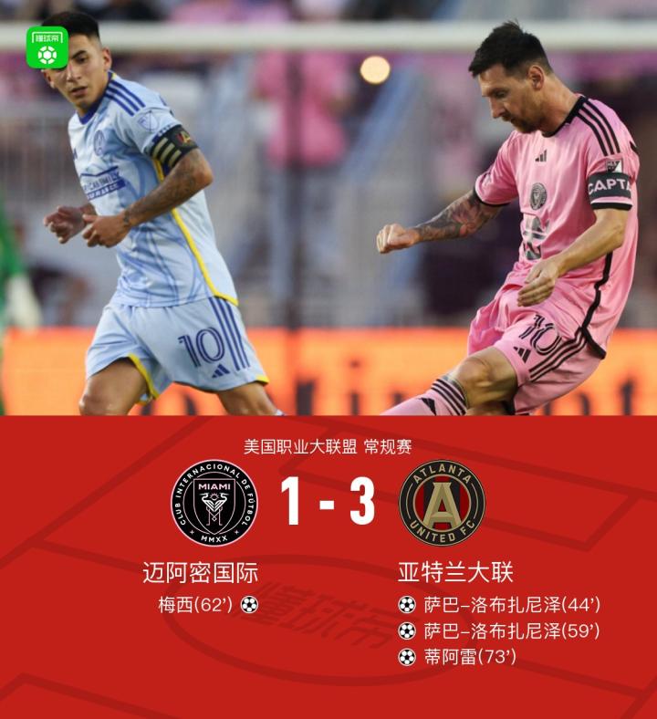 北京时间5月30日美职联常规赛,迈阿密国际主场对阵亚特兰大联。比赛第44分钟,萨巴-洛布扎尼泽轰进一脚世界波,第59分钟,萨巴-洛布扎尼泽远射再下一城,第62分钟,梅西接布斯克茨助攻打进贴地斩,第73分钟,蒂阿雷门前轻松得分。最终比分迈阿密国际 1-3 亚特兰大联。