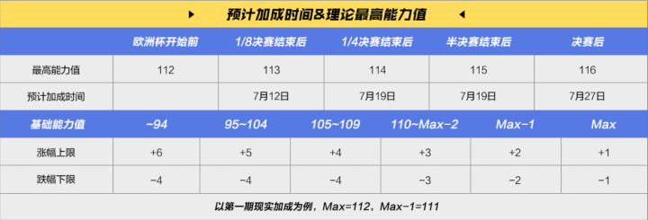 EU24赛季能力值不固定,根据球员在欧洲杯赛场的表现,还会有四次加成机会,最终的理论最高能力值是116。每轮的加成时间和最大能力值,通过这个图表展示,规则和23U赛季类似。