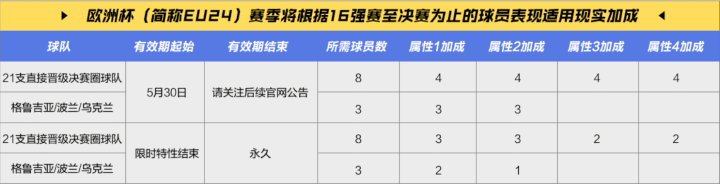 21支直接晋级欧洲杯正赛的球队,他们的加成属性有四项,每项属性能加4;等到了限时期限,将转化为永久加成,但加成幅度将减少。