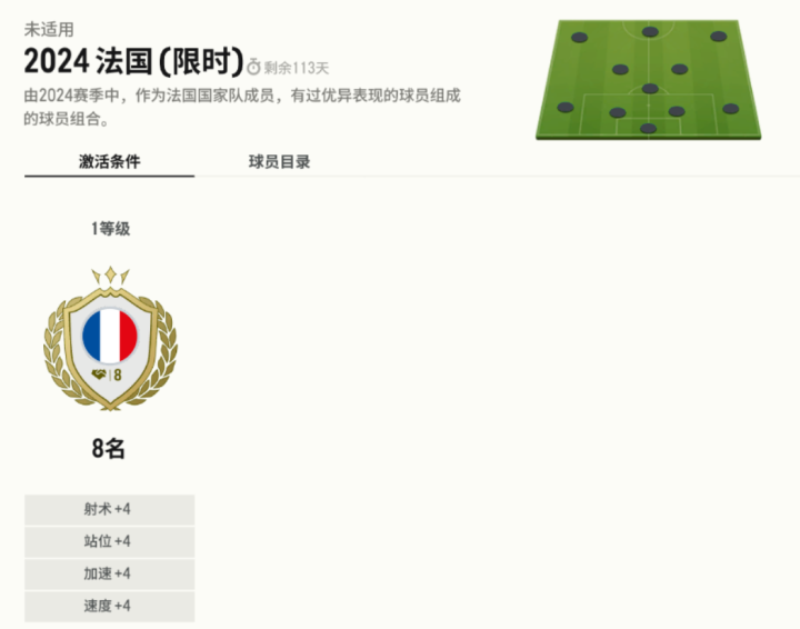 举个例子说明,限时期间,2024法国队的加成是射术+4、站位+4、速度+4、加速+4;限时结束后,将变成永久加成,射术+3、站位+3、速度+2、加速+2。其他国家队的加成,大家可以到游戏内查看。