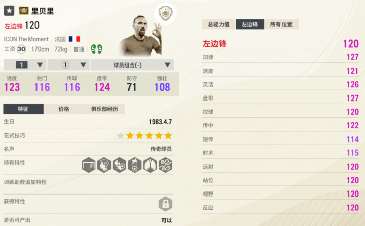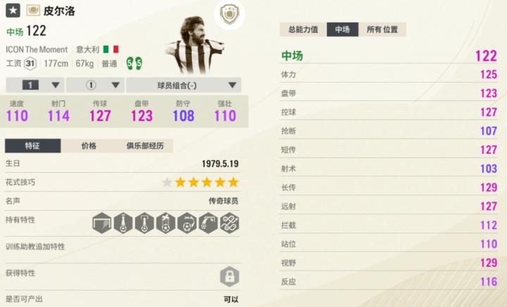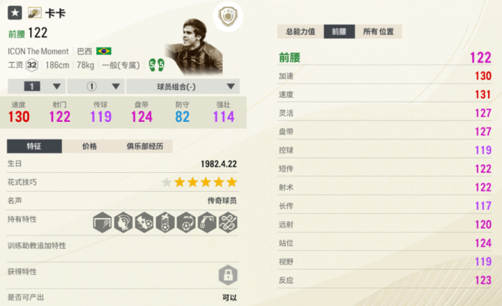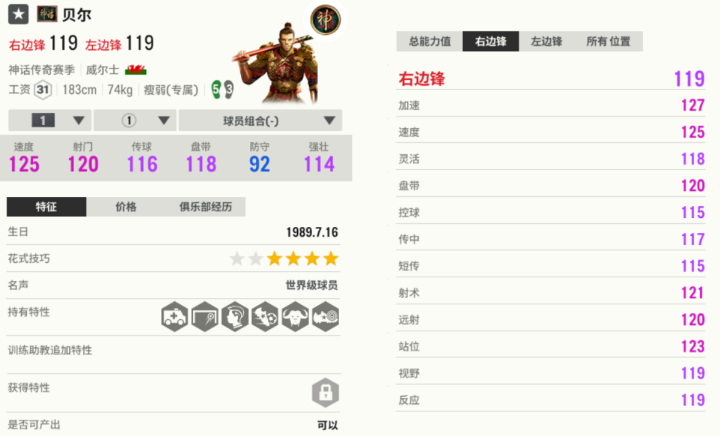 神话传奇赛季贝尔的起始能力值是119、工资31,是最强版本的贝尔。这张贝尔持有“善于头球”“善于搓射”“花式大师”等优质特性;超高的速度让他“腾云驾雾”,在绿茵场上飞扬。