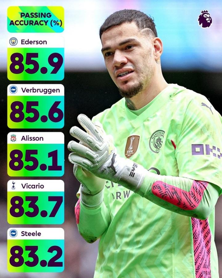 本赛季英超门将传球成功率排行:埃德森居首,费布鲁亨第二