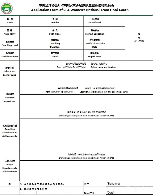 3.具有成为U20国家女子足球队主教练的强烈意愿,能够严格遵守中国足协的各项规章制度;