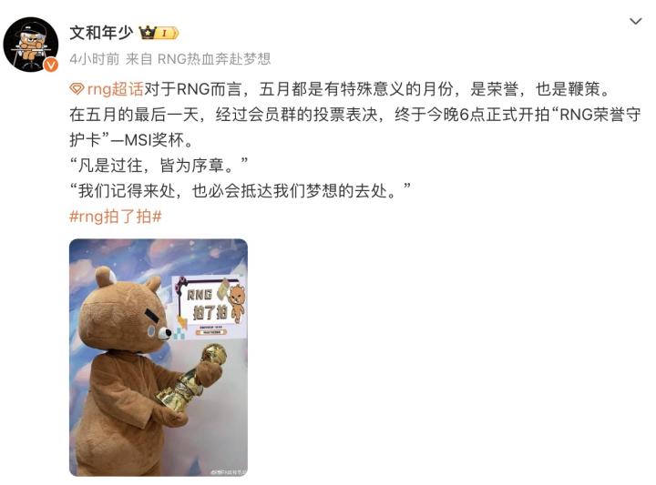 RNG现任CEO下午更新动态,今晚18点将继续拍卖,并配上了队伍吉祥物小熊玩偶捧着MSI复刻奖杯的图片,疑似今晚将拍卖MSI奖杯。